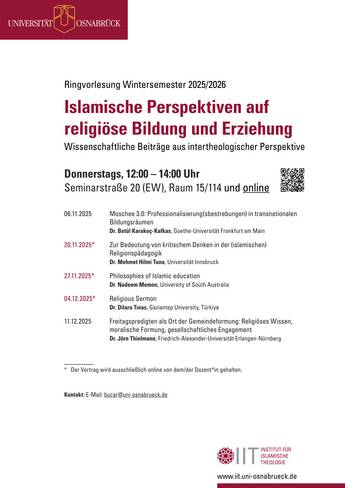Das Fach Islamische Religion an öffentlichen Schulen in Niedersachsen war am 24. 09. Thema am Institut für Islamische Theologie (IIT) der Uni Osnabrück. Gemeinsam wurde diskutiert, wie das Fach Islamische Religion besser ausgebaut werden kann, um mehr muslimischen Schülerinnen und Schülern in Niedersachsen islamischen Religionsunterricht an öffentlichen Schulen anbieten zu können.
